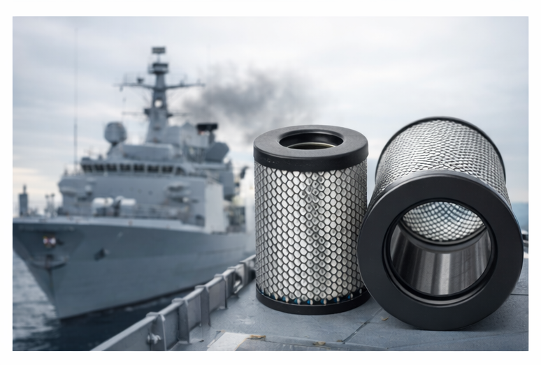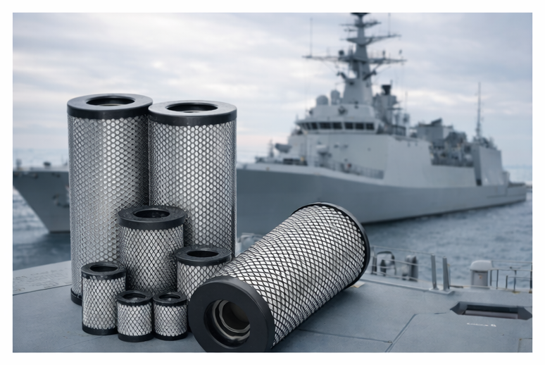 Applications include military vehicles, naval vessels, power generation units, and ground support equipment, where filtration reliability directly impacts mission readiness.